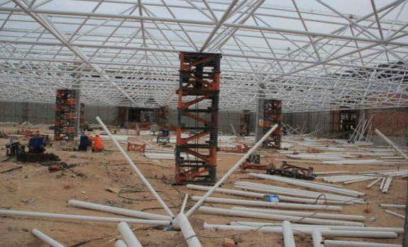 5)总体晋职法:此步履多使用在周边支护以及有多点支护的网架结构,可采取平板升降机、液压千斤顶等小型机具作业丰台施工;